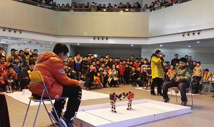 木牛流馬搏擊機器人亮相典禮現(xiàn)場,為現(xiàn)場的領(lǐng)導、老師、家長和小朋友們演示機器人搏斗,吸引了在場所有人的目光,激烈搏斗場面引起小朋友們的陣陣歡呼,掌聲四起,氛圍熱烈。